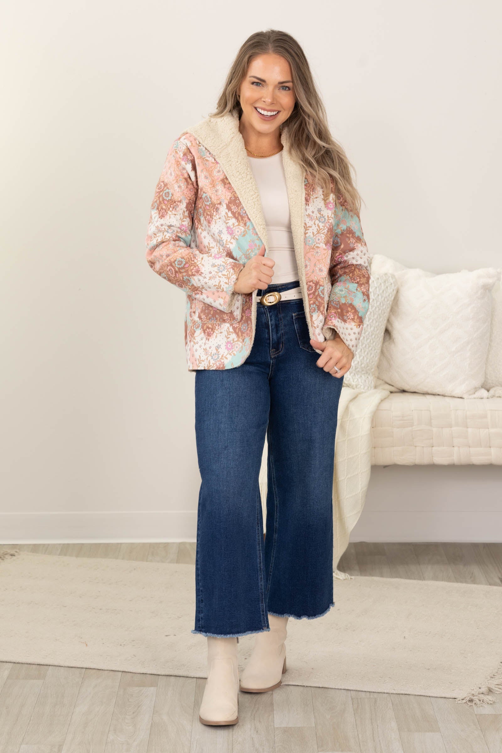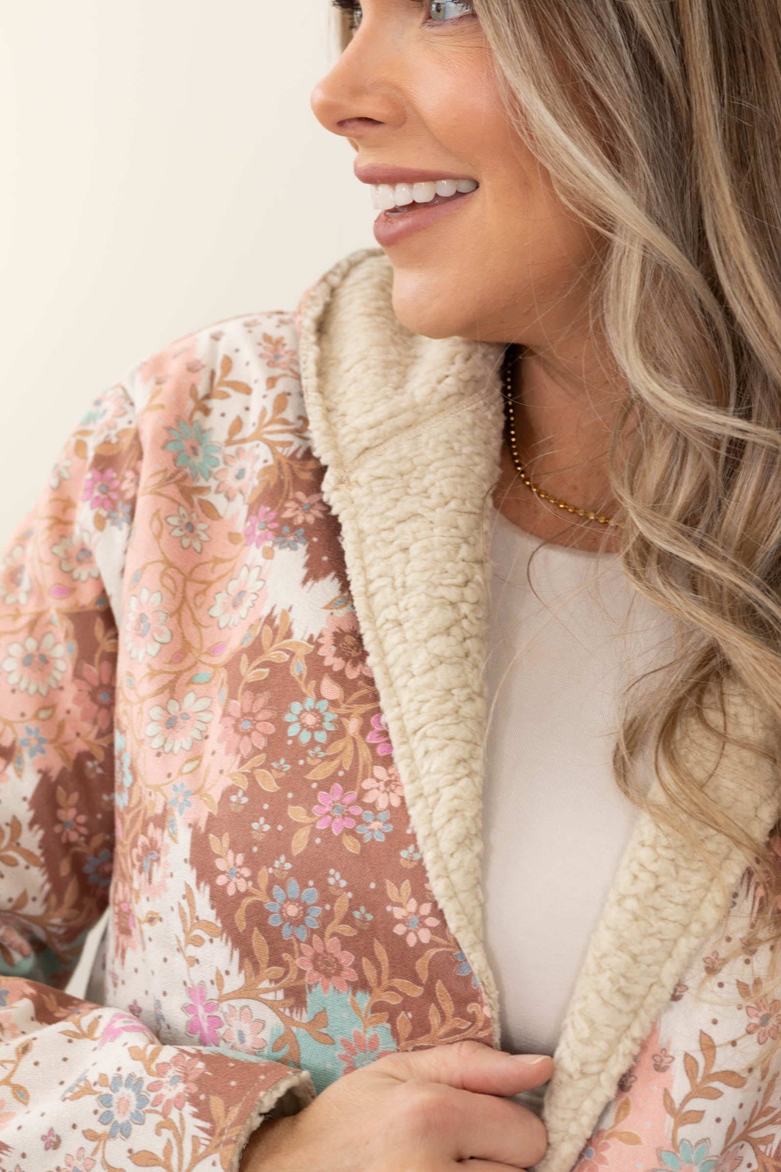 Beige Multicolor Patchwork Print Sherpa Jacket