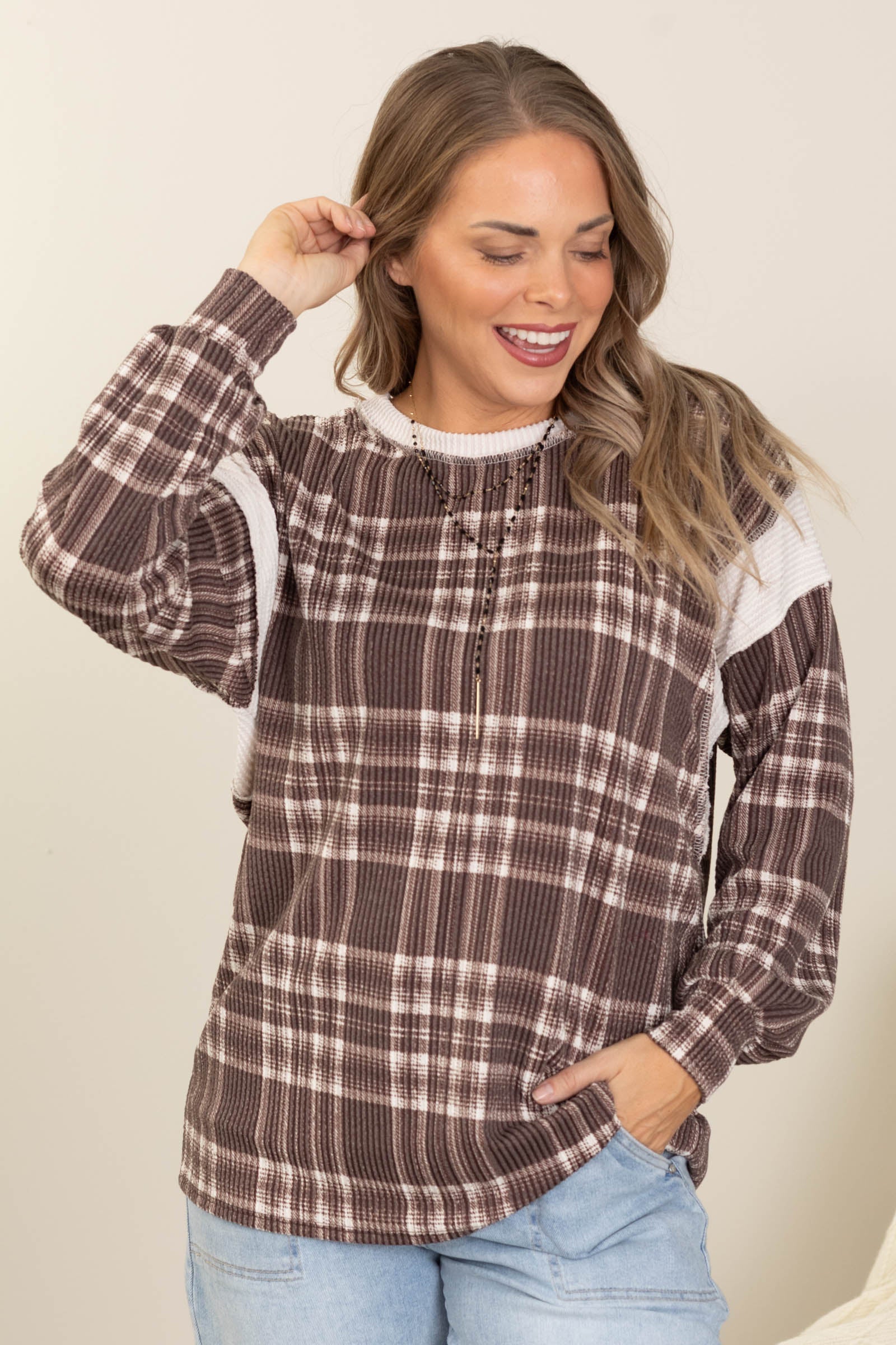 Brown Plaid Ribbed Knit Long Sleeve Top