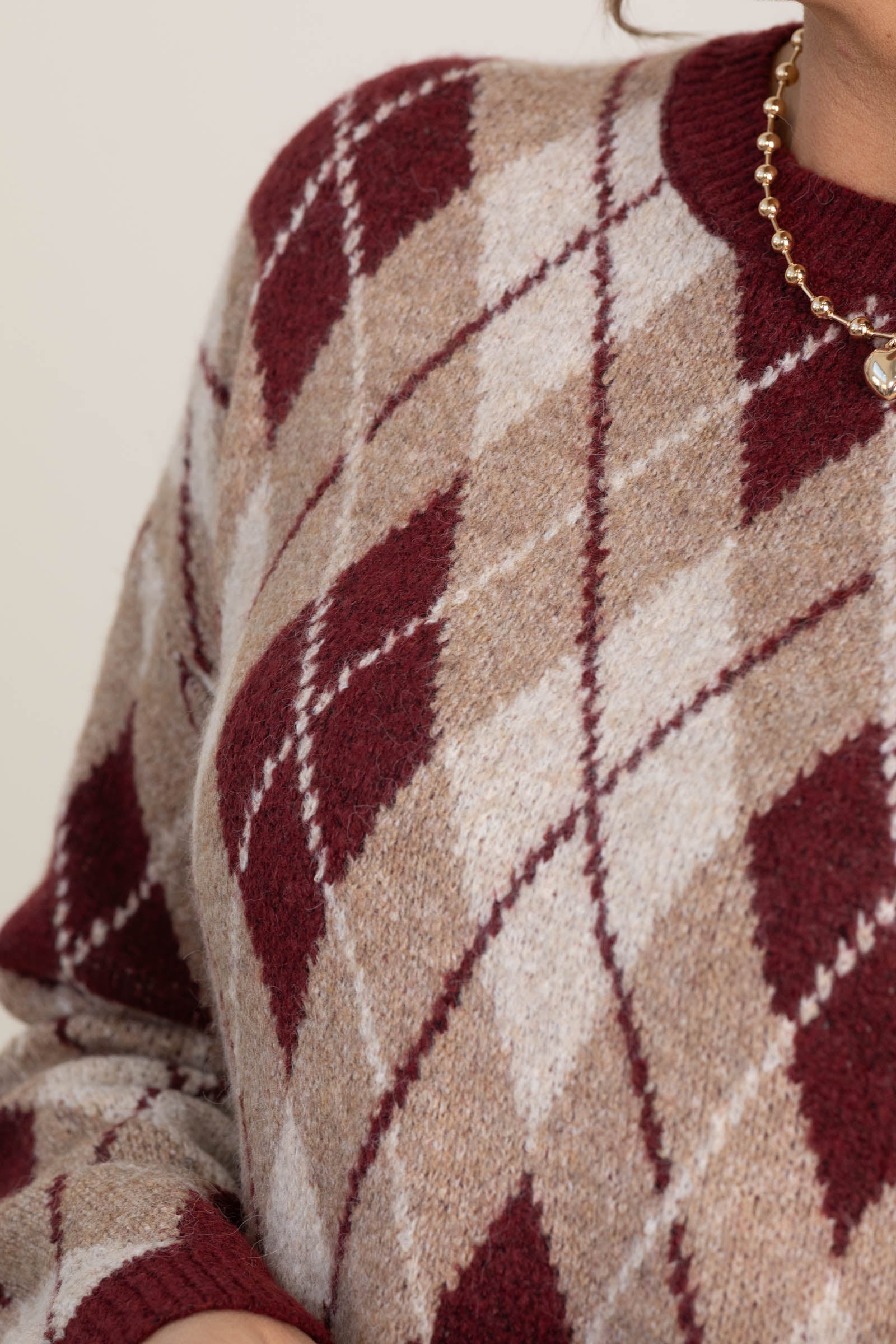 Burgundy Argyle Pattern Long Sleeve Sweater