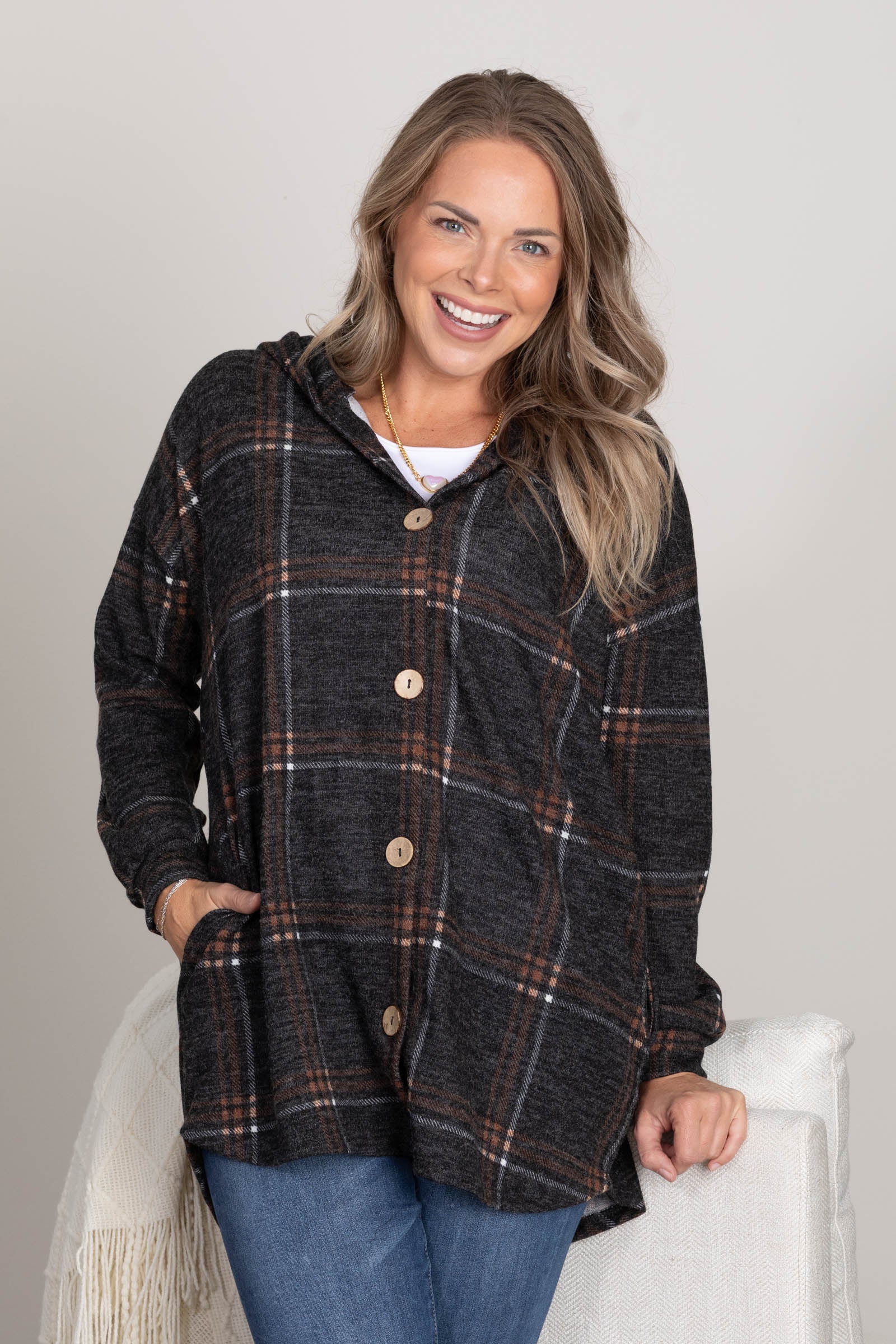 Charcoal And Camel Plaid Hooded Light Shacket