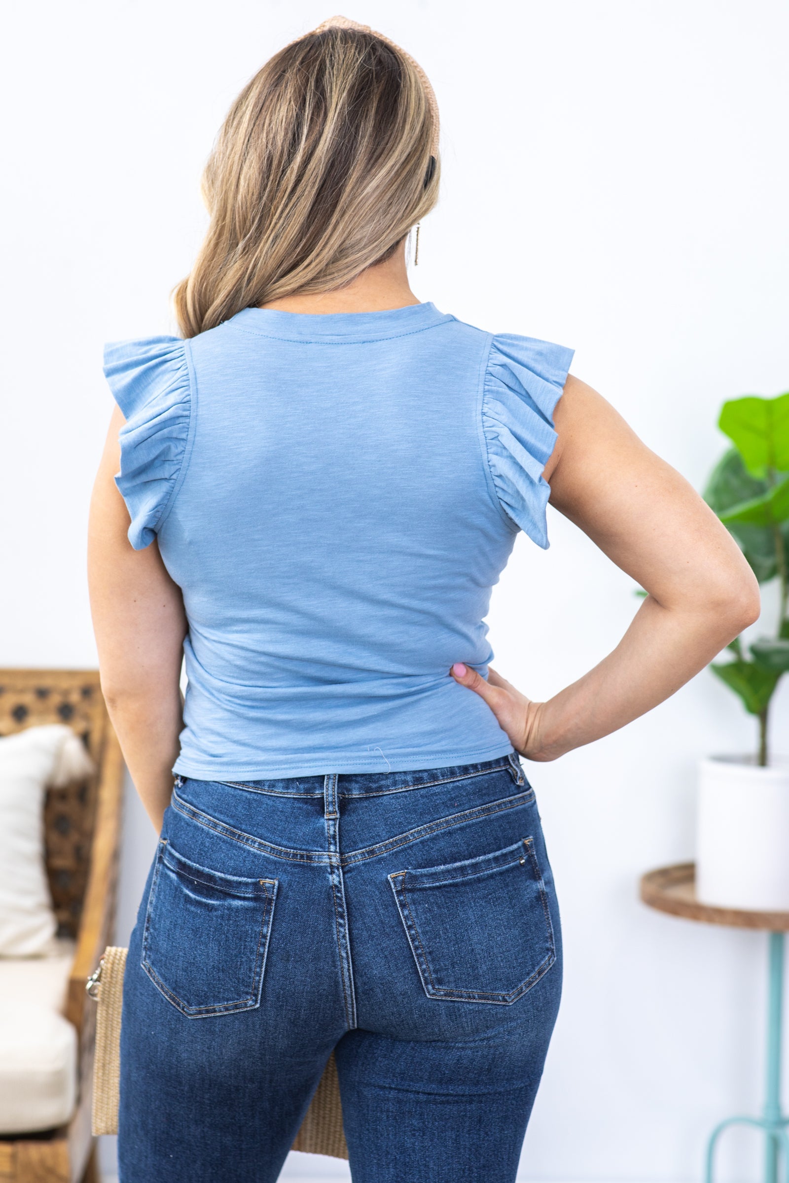 Dusty Blue Ruffle Sleeve Cotton Slub Knit Top