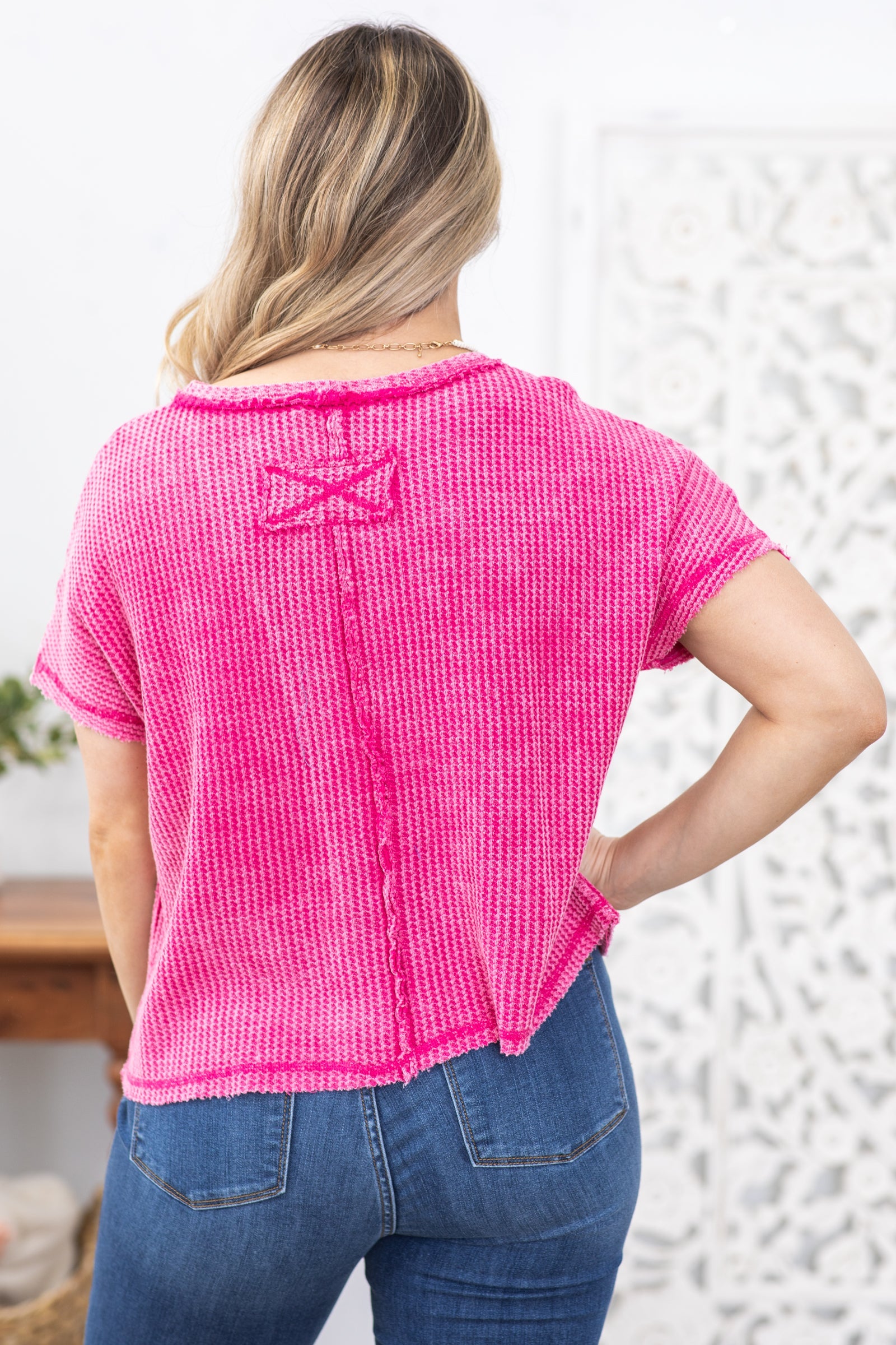 Fuchsia Washed Stitch Detail Waffle Knit Top