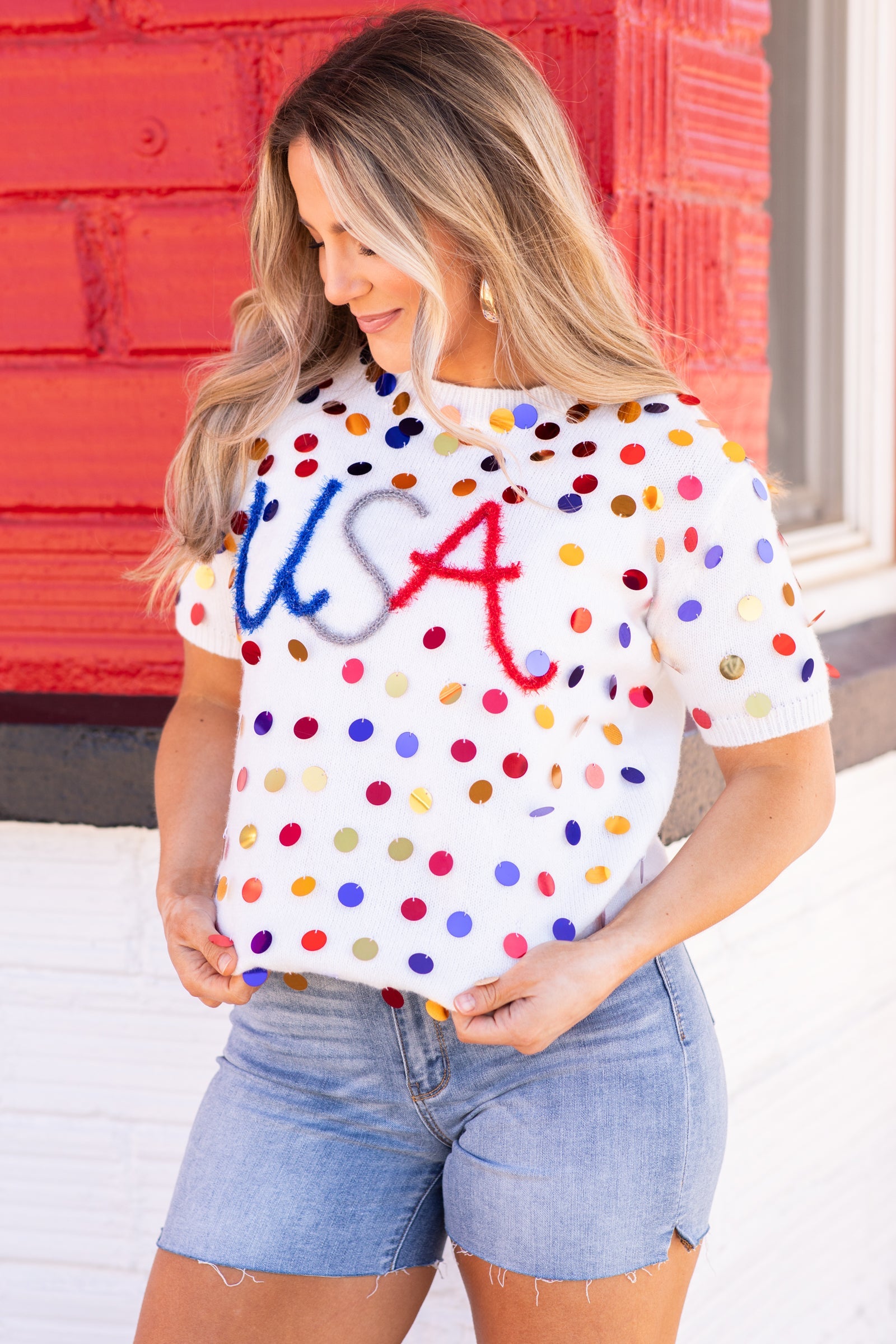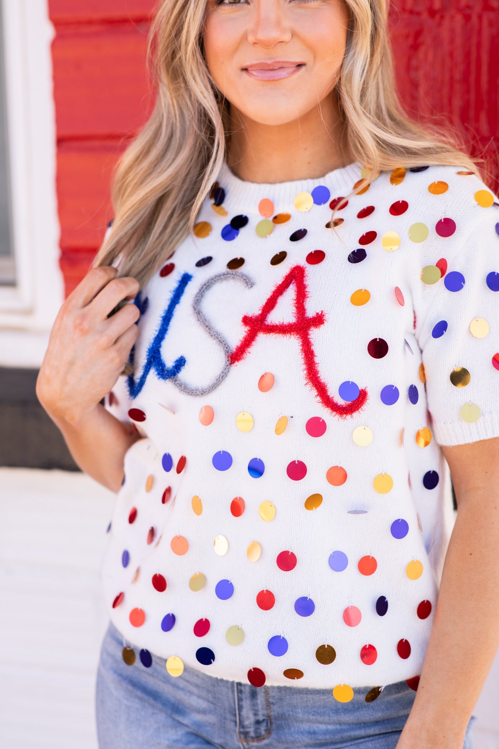 White Paillette USA Lightweight Sweater