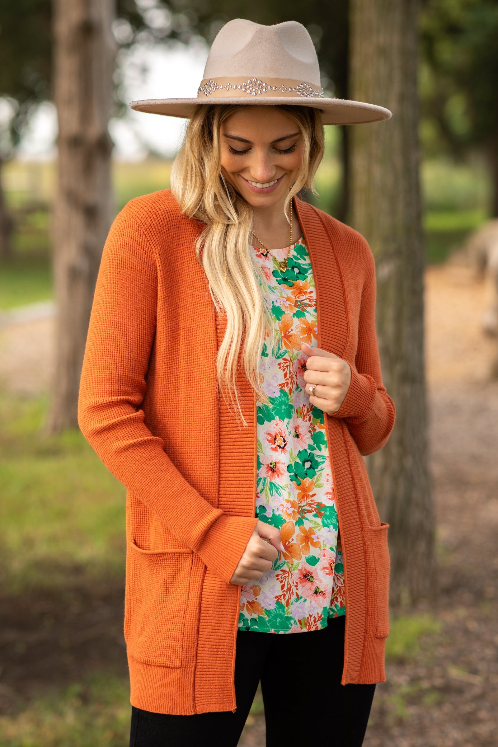 - Shown with Burnt Orange Waffle Knit Patch Pocket Cardigan