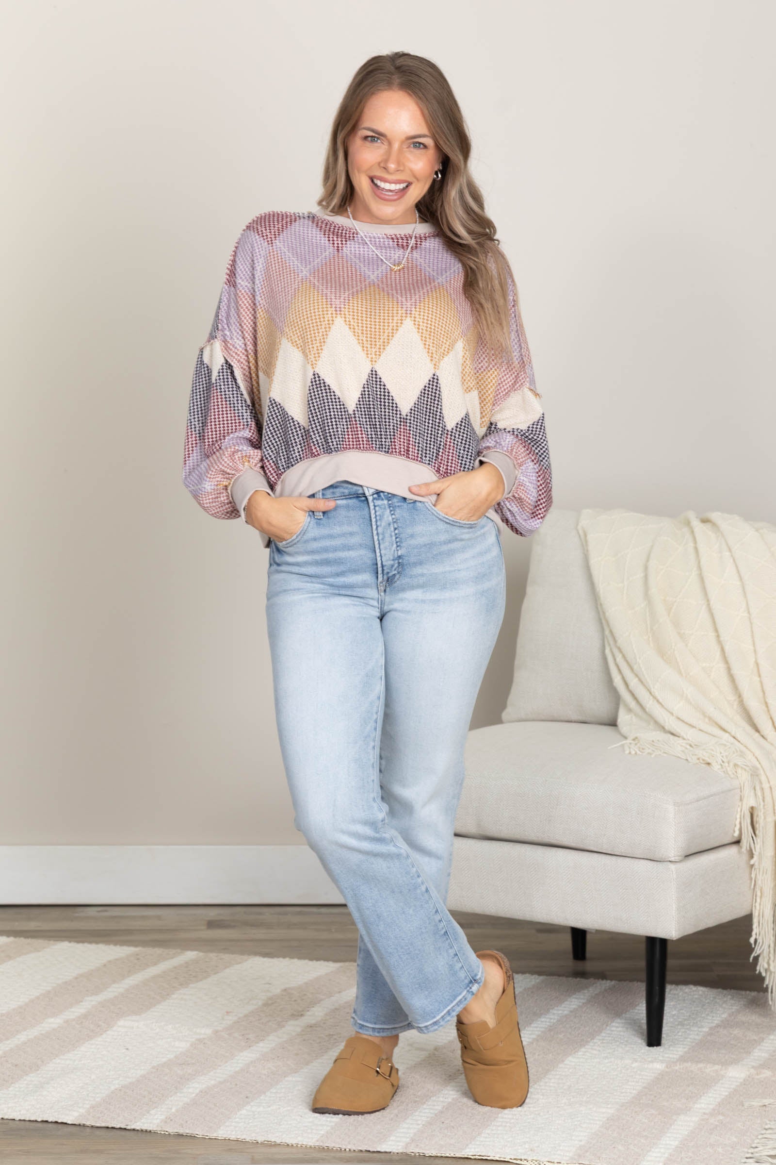 Light Mocha Argyle Print Long Sleeve Knit Top