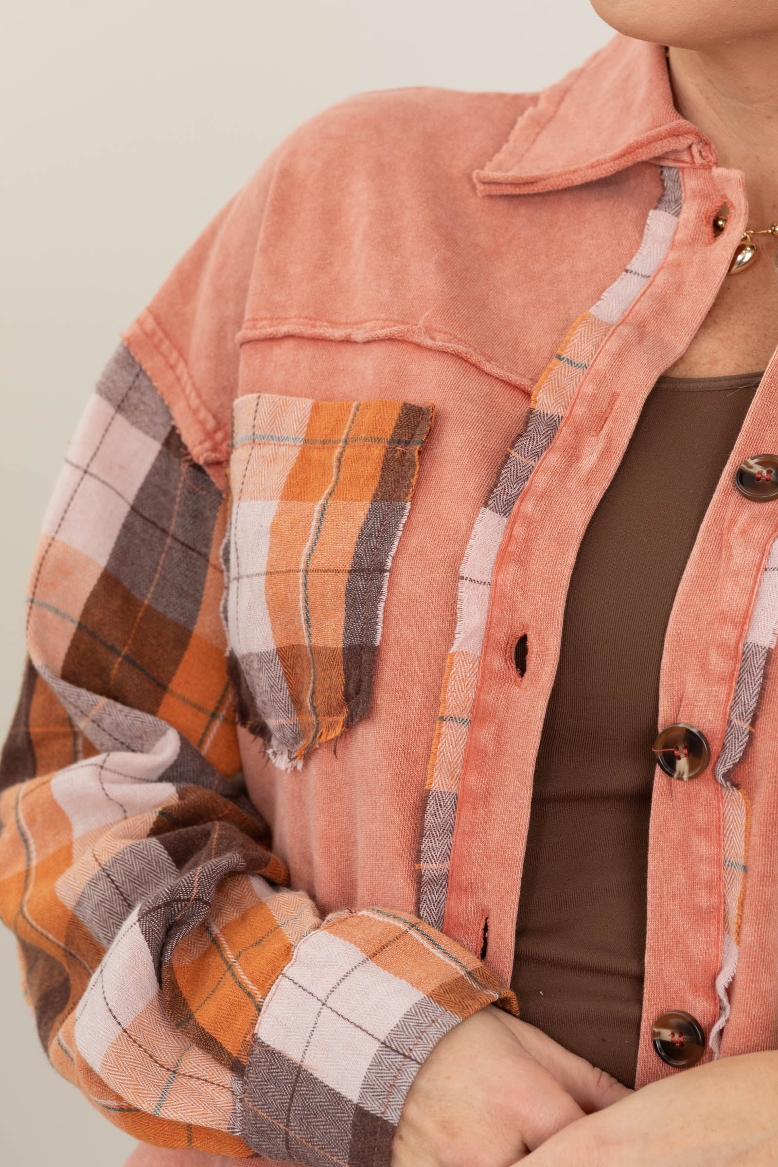 Plaid Sleeve Mineral Wash Shackets