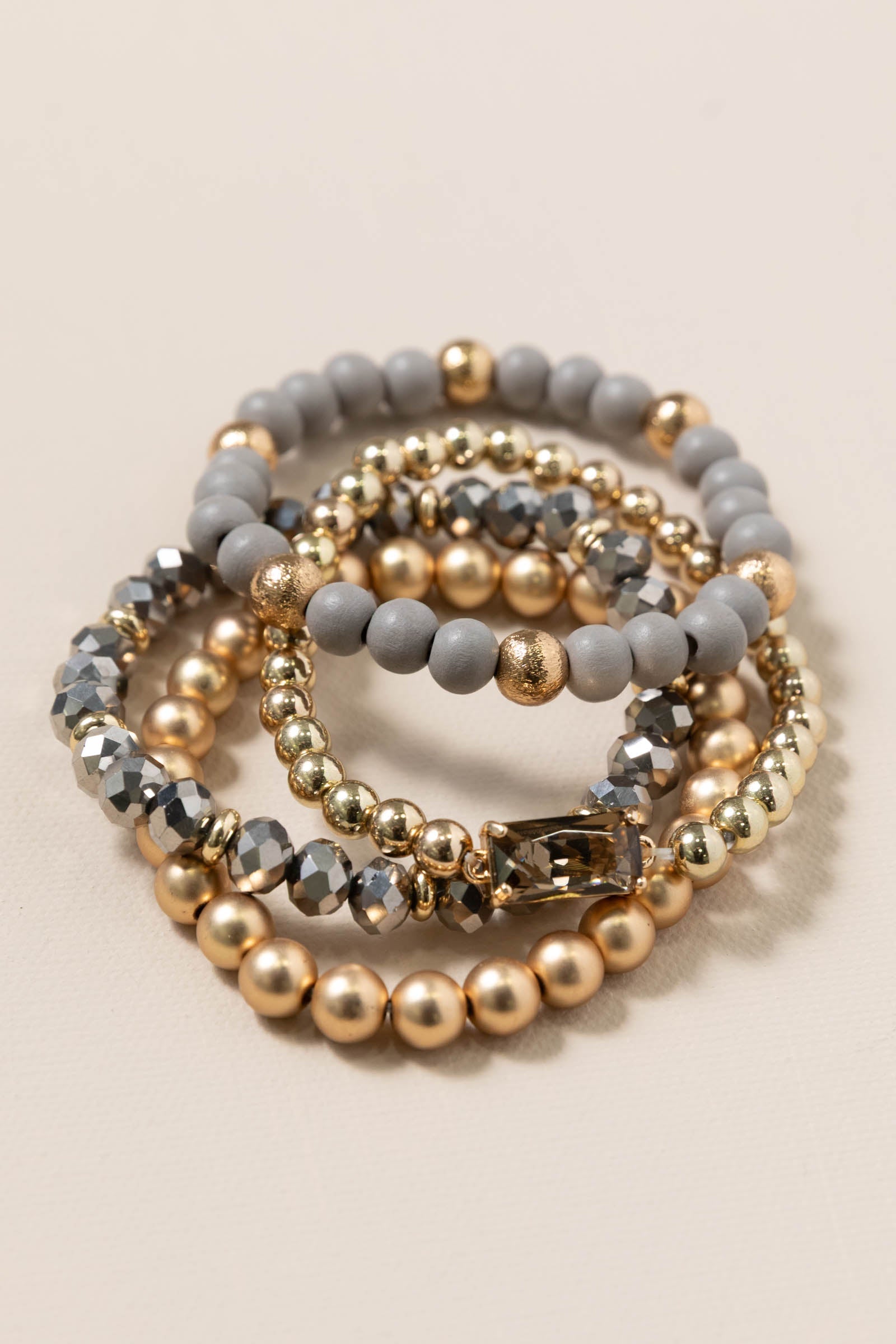 Grey Wood Crystal Beaded Set of 4 Bracelets