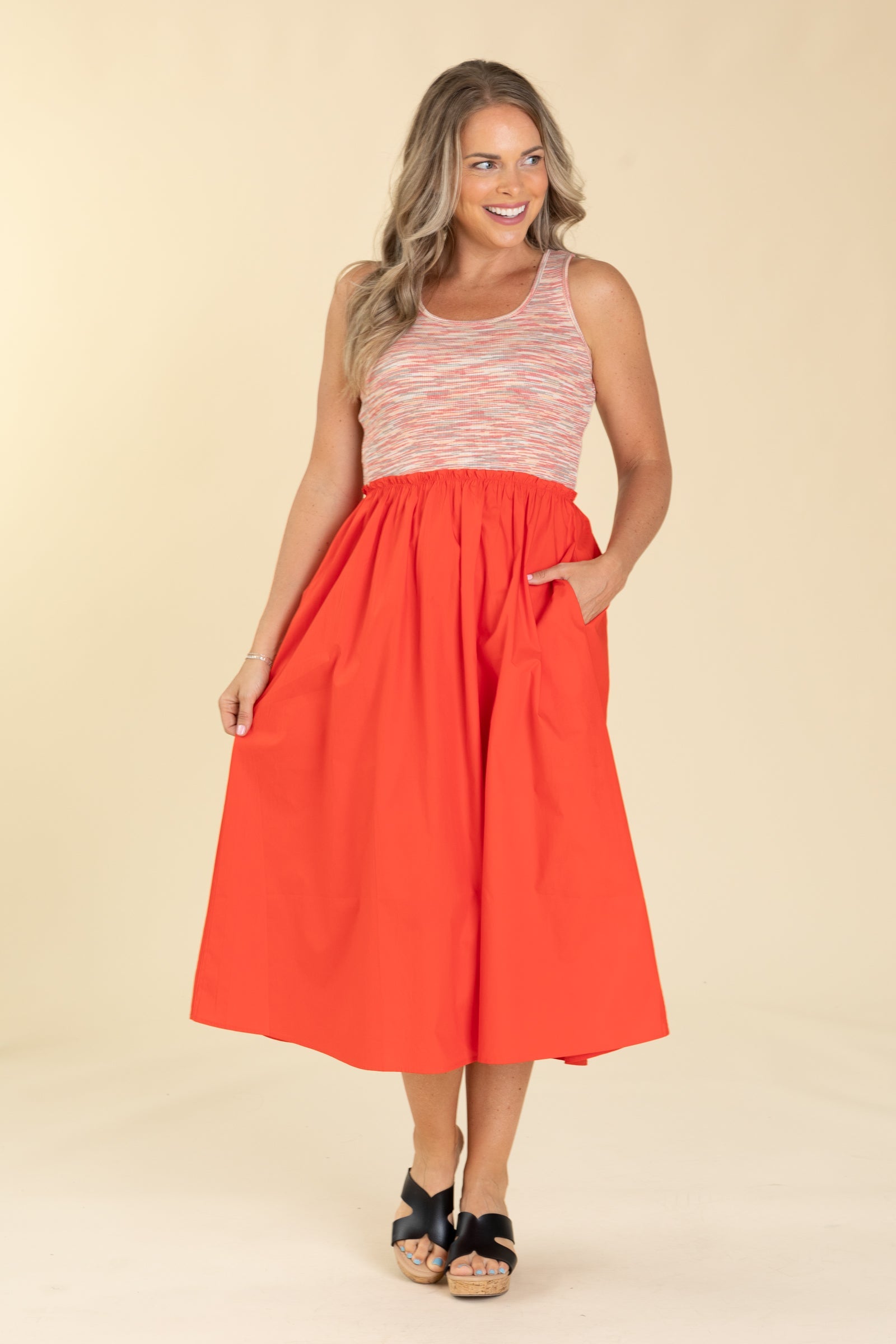 Red Multi Fabric Midi Dress With Pockets