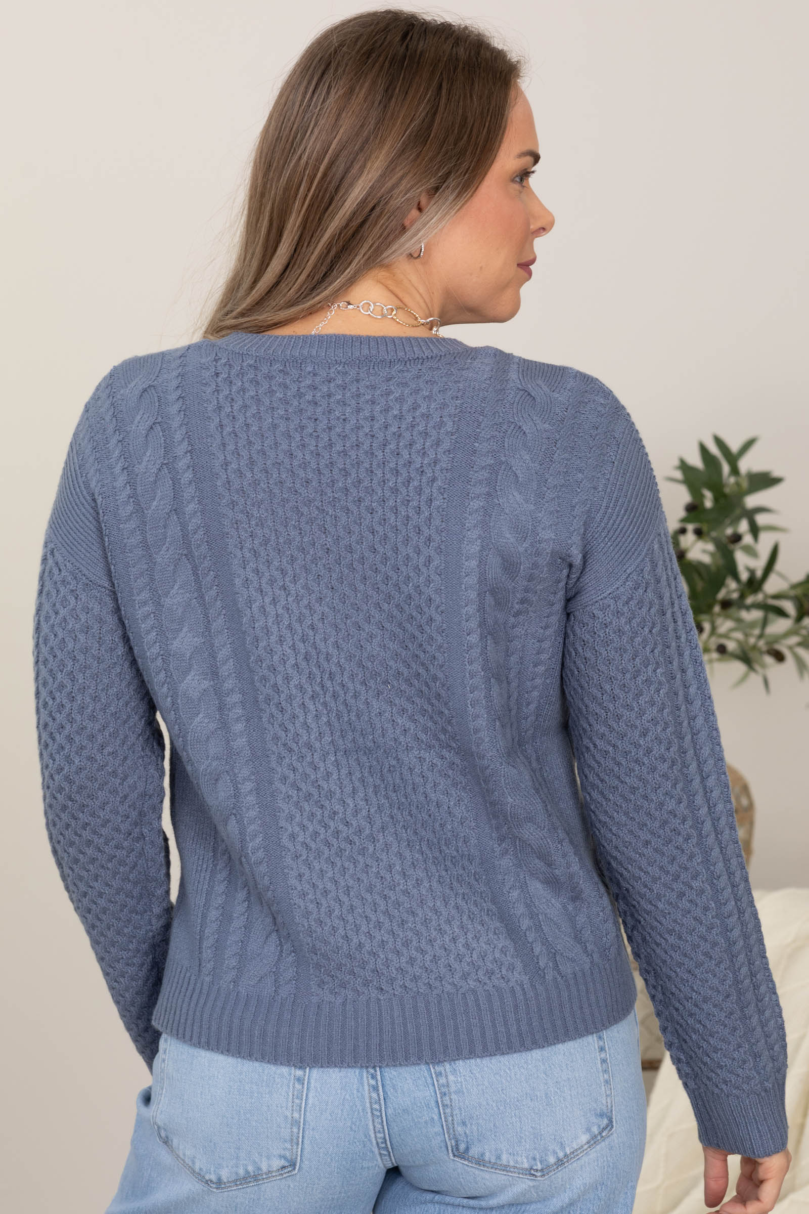 Slate Blue Classic Cable Knit Crewneck Sweater