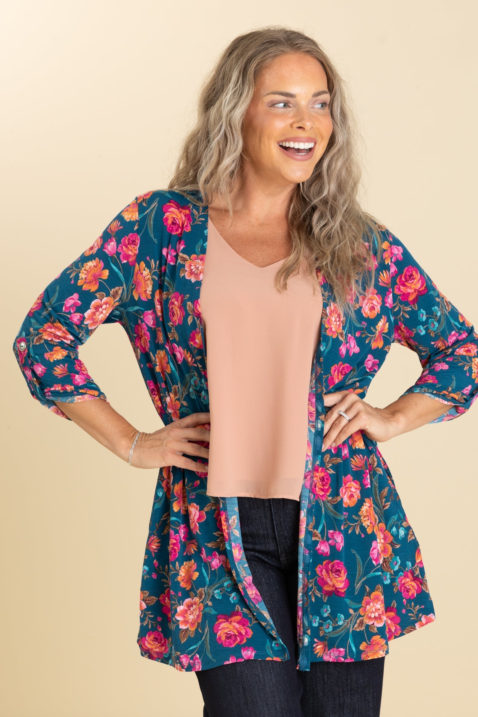 Teal Floral Open Front Wrinkle Free Cardigan