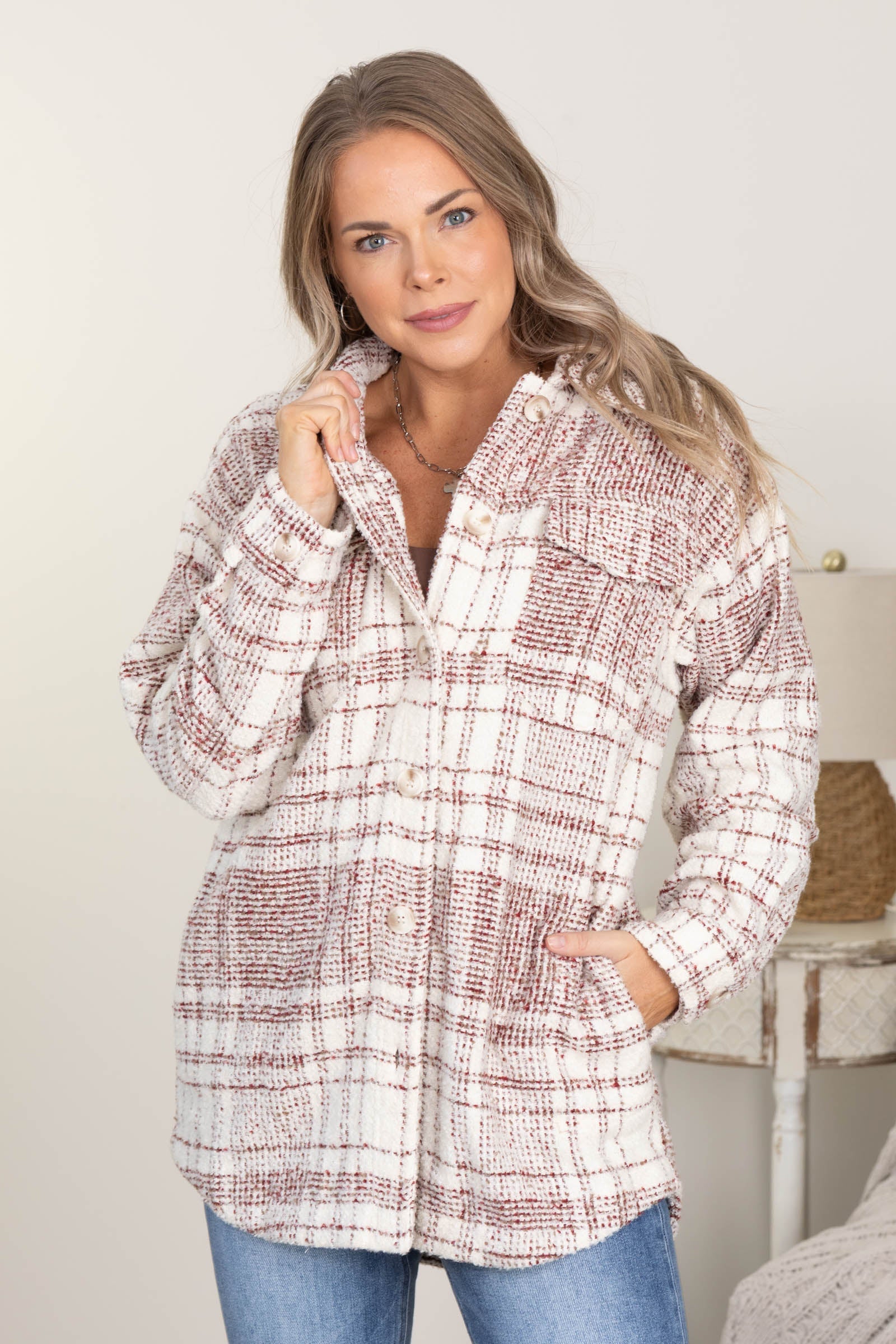 Unique texture without the feeling of texture. and a plaid colorway that will age finer than the finest wine! Unexpectedly bendy. middle weight. and stylish you will be obsessed the second you feel this fabric for yourself. Wine is THE color of the season. and this particular print offers the perfect balance of color and neutrals. Too easy to dress up. make this jacket the star of the show with a light weight mock neck to flatter the shoulders. or throw on your coziest sweatshirt and joggers to run everyday errands. No matter where your day takes you. this jacket is a must to bring along!